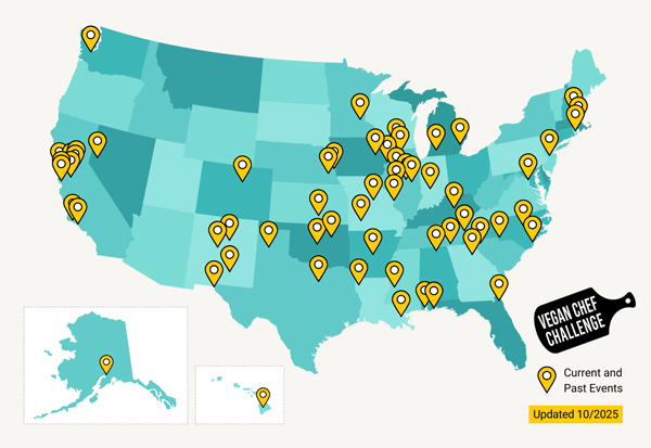 Vegan Chef Challenges create a positive buzz about veganism in areas that don’t normally have many options with over one-third of restaurants that didn’t have a vegan entree keeping one after the challenge ends. In all, we held vegan chef challenges in 43 cities in 2024.